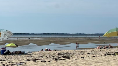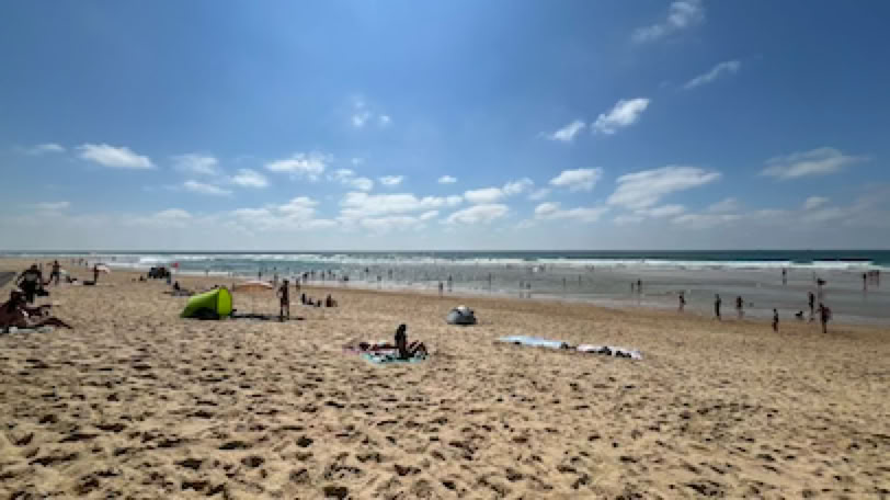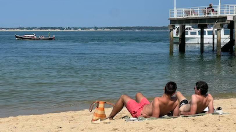 Retour à la maison pour un déjeuner simple (melon et salade de riz). Repos, sieste … A 17h, direction la plage Pereire. Comme hier, la mer est haute et le courant fort. Je fais du surplace en nageant le crawl. Puis bronzette jusqu’à 19h. La plage est calme et familiale.