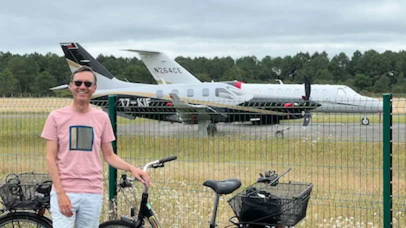 Il fait un peu gris ce matin. Nous prenons nos vélos et faisons d’abord une pause café au Barathym. Et nous prenons ensuite la direction de l’aérodrome d’Arcachon. Sur place, pas de trafic sur l’aérodrome. Un couple qui vient d’arriver avec son hélicoptère Bell-Ranger le prépare tranquillement pour stationner quelques jours sans doute. Sur le tarmac, un TBM et un Citation sont garés. Nous allons repartir quand arrive en finale, tous feux allumés, un beau Pilatus en provenance du Bourget. Il se pose, avec le bruit caractéristique de la turbine et de la grosse hélice en reverse. Impressionnant. Le Pilatus vient rapidement se parquer devant la tour. Un homme élégant en descend et partira quelques minutes après dans son taxi qui l’attend déjà. Pratique pour vernir à Arcachon ! Les deux pilotes eux, repartiront avec l’avion dans une heure. Pas d’autre trafic, et nous reprenons les vélos pour le retour, mais en passant au Sud de l’aérodrome, par une longue route fréquentée et sans piste cyclable, pas très agréable.