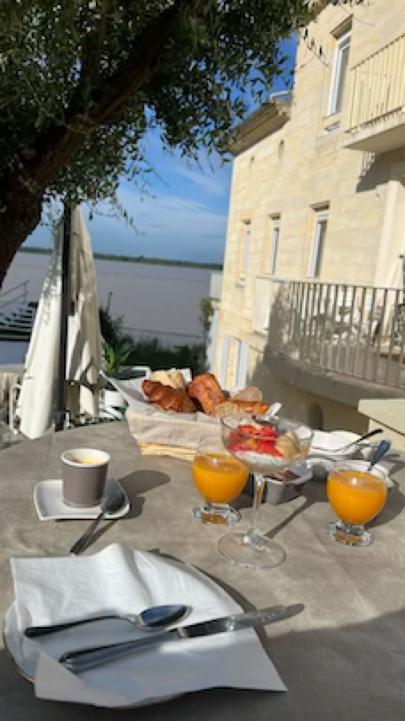 Il y a trop de vent pour que le dîner soit servi en terrasse et donc nous dînons en intérieur. Le patron qui tient la maison est un excellent cuisinier et nous nous régalons de poissons accompagnés de verres de Côte de Bourg généreusement servis.