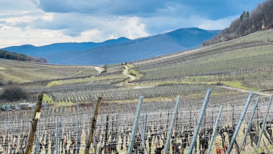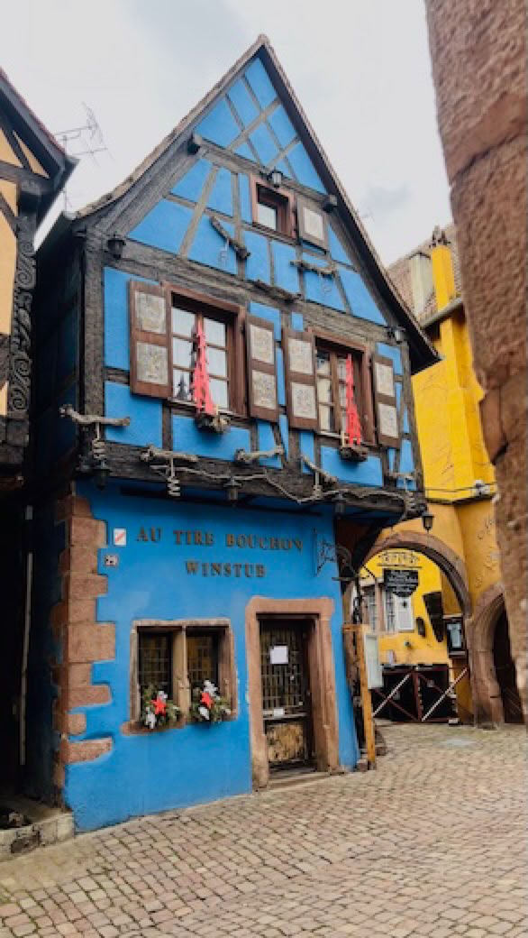 Aujourd’hui, nous allons marcher ! Pierre a trouvé un itinéraire sympa qui part du petit village alsacien typique de Kienstheim à 80 km de Colmar. Nous nous garons près de la porte de ce village. La route monte d’abord doucement entre les vignobles, puis après un calvaire, monte nettement plus fort dans la forêt. Mais de là haut, nous avons une belle vue sur les vignobles et au delà, sur les Vosges. Après deux bonnes heures de marche, nous arrivons au très typique village de Riquewihr. La rue pavée principale est bordée de maisons à colombage colorées. Peu de monde à part un groupe scolaire. Ca doit être très très différent en saison … Nous trouvons in-extremis une échoppe pour y acheter un Bretzel pour Pierre et un donut (trop gras) pour moi, histoire d’avoir quelque chose dans le ventre pour le retour. Après un tour rapide dans les petites rues, nous prenons un autre chemin pour le retour, avec un ciel qui se fait de plus en plus menaçant. En pressant le pas, nous arrivons à la voiture, à Kienstheim, alors que l’averse commence. Juste le temps de se mettre à l’abri du hayon pour changer de chaussures.