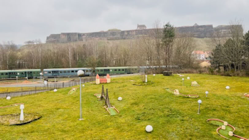 Après cette visite, nous rejoignons Bitche, sous la pluie. Nous avons réservé une chambre dans un hôtel … qui devait être moderne dans les années 70 (mais néanmoins, chambre confortable et à jour), en face d’une grande gare … désaffectée, et de l’imposante citadelle militaire qui domine la ville.