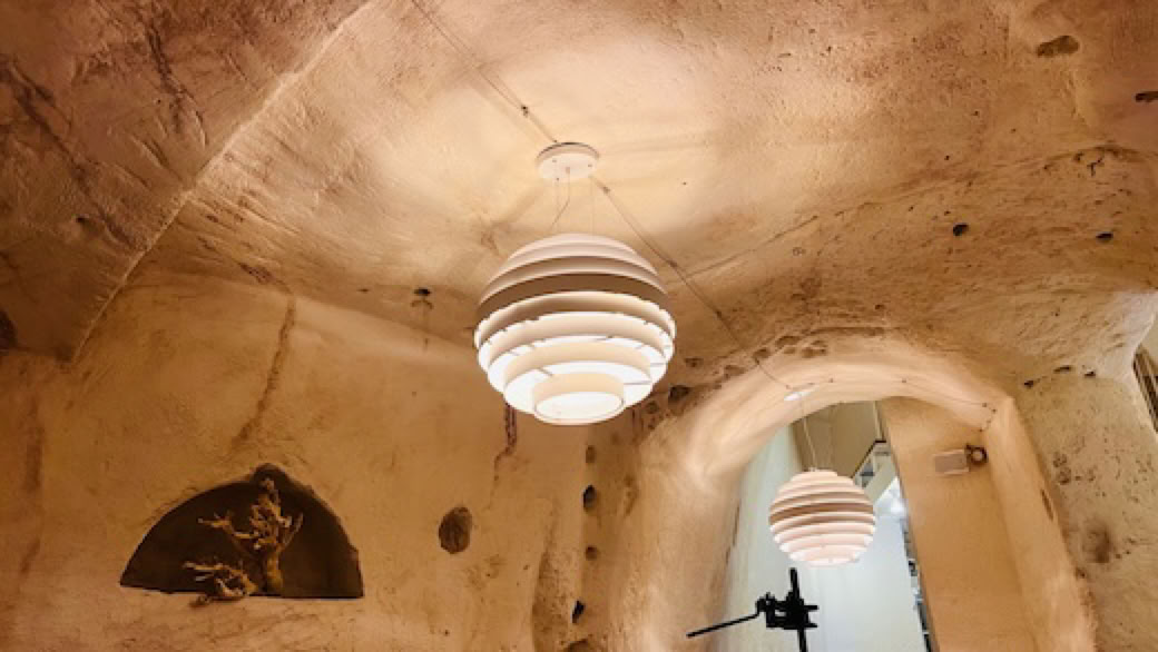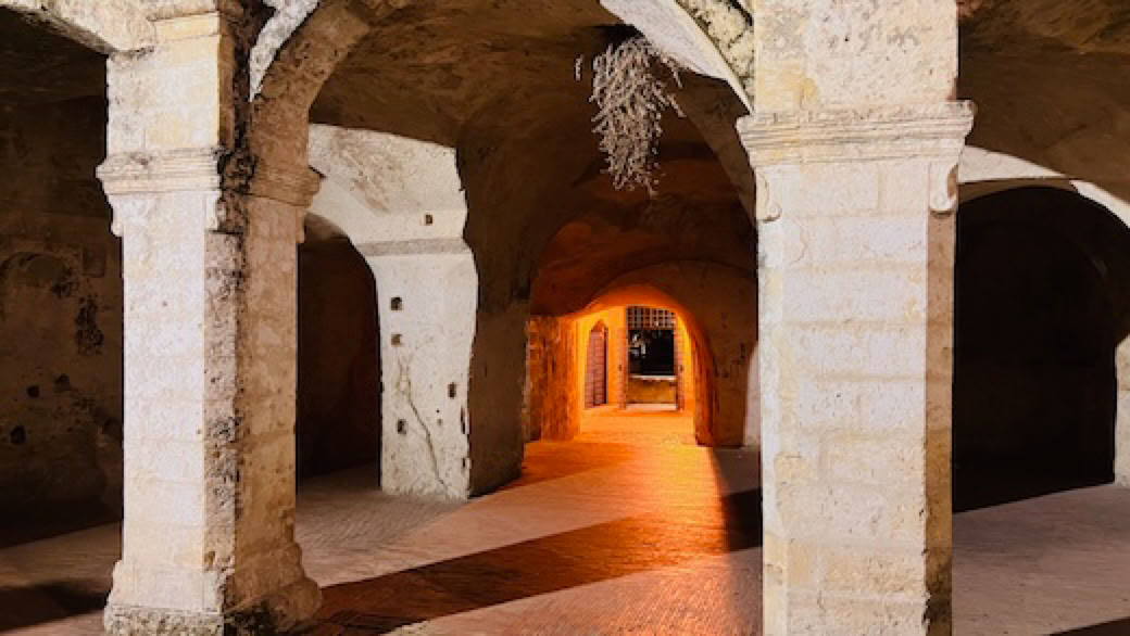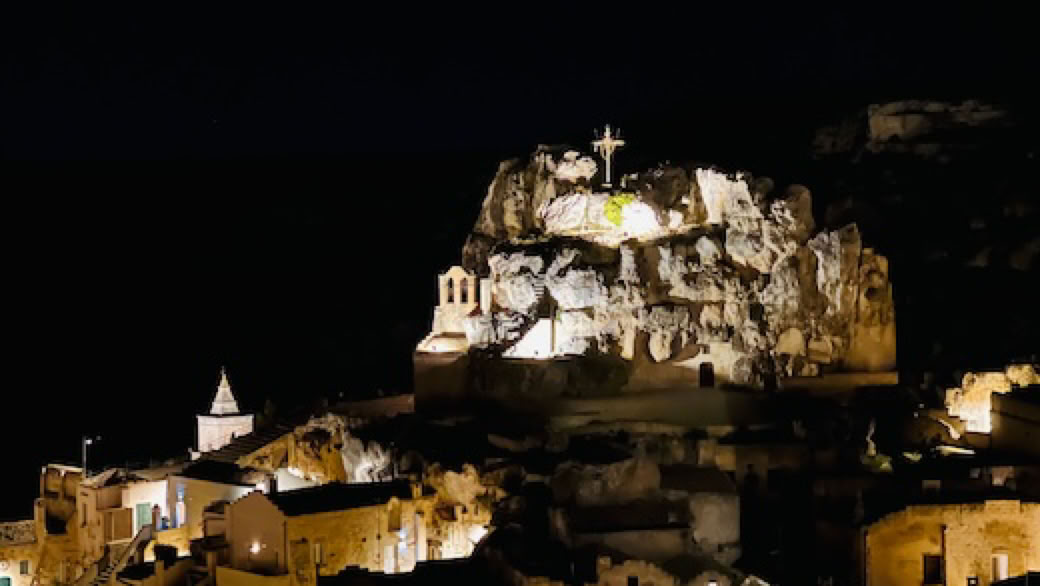 Départ de l’appartement un peu avant 7h, un coup de RER E et B pour arriver à CDG 2F vers 8h. Les bornes automatiques de Check-In sont hors-service et seulement 2 personnes aux guichets pour déposer les bagages … Heureusement, nous avons de la marge, et la sécurité est passée rapidement. L’avion décollera finalement avec 20’ de retard, mais grâce aux contrôleurs italiens et au vent, notre A321 arrivera à l’heure à Rome avec le beau temps ! Les bagages sont délivrés assez rapidement et avant de récupérer la voiture de location, nous nous restaurons rapidement d’une focaccia. Nous avons bien du mal ensuite à trouver les guichets des sociétés de location de voitures et après un détour par la gare, nous trouvons finalement le guichet SIXT, et récupérons une grosse Jeep Compass PHEV 4x4 au lieu de l’Alfa Junior que j’avais réservée. Un peu vieille et le réservoir pas complètement plein, mais finalement, cette voiture sera bien confortable et pratique sur tout notre séjour. Nous partons donc pour 5 bonnes heures de route pour descendre à Matera. Le paysage devient intéressant une bonne centaines de kilomètres avant Matera : valloné et désertique, de longues lignes droites limitées à 70 km/h … où tout le monde roule entre 90 et 100 km/h. L’arrivée à Matera n’est pas très belle, mais notre hôtel Casino-Ridola est très joli, une grande bâtisse au style bien italien. Nous nous installons dans notre chambre spacieuse, au plafond vouté, dotée d’une immense terrasse … et au matelas très dur. Vers 18:30 (il fait déjà nuit), nous partons à pied vers le centre historique, à 10’ de l’hôtel. C’est un choc visuel ! Un incroyable enchevêtrement de ruelles, d’escaliers, de petites maisons, de rochers, d’églises. Tout est mineral, y compris le pavage en pierre des rues. En bas, un cayon. On aurait envie de tout explorer mais nous avons faim et nous trouvons un restaurant agréable en bas de la rue principale, le Keiv. Et nous dînons en terrasse … un 25 octobre ! Premier Spritz, du bon vin blanc, une bonne cuisine italienne … les vacances commencent bien ! Il faut quand même tout remonter pour retourner à l’hôtel !