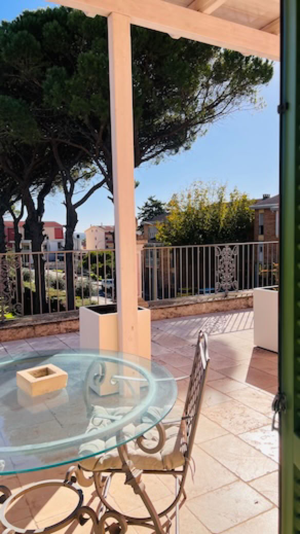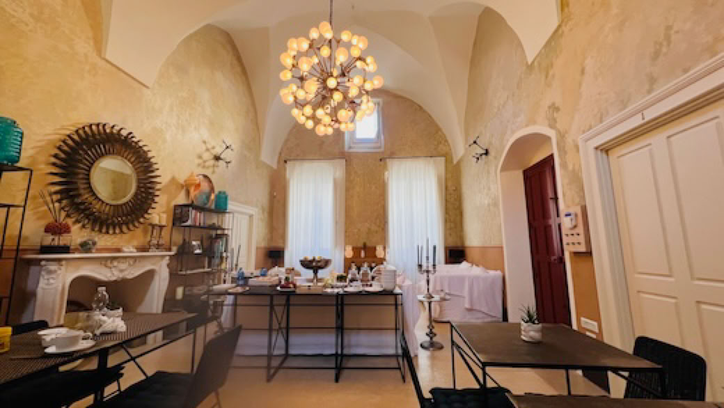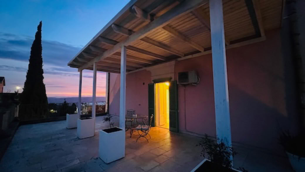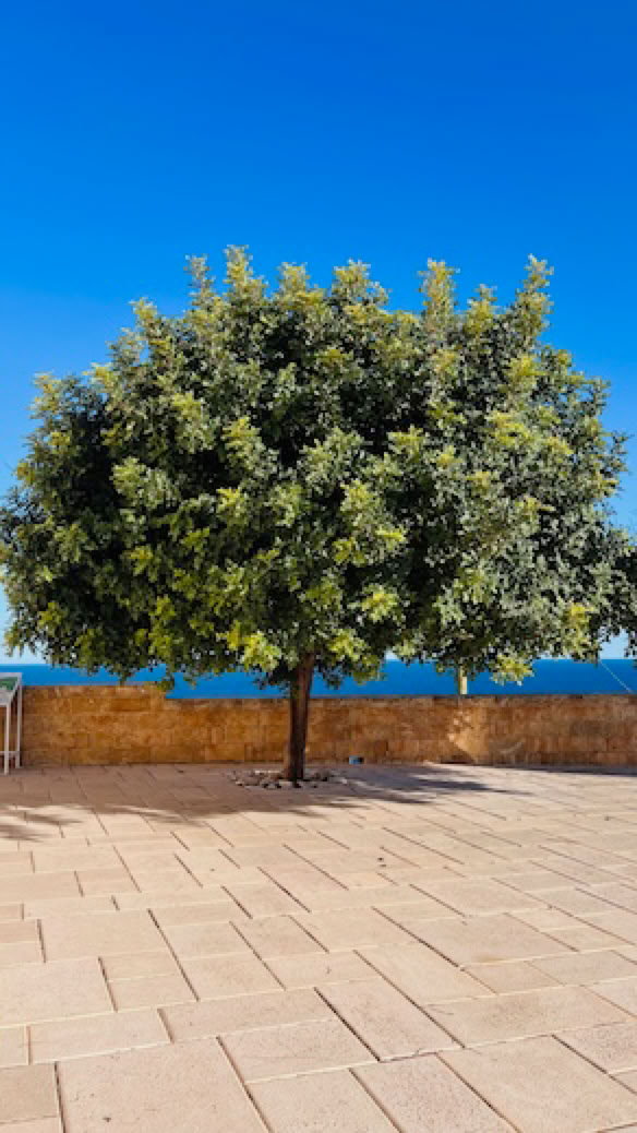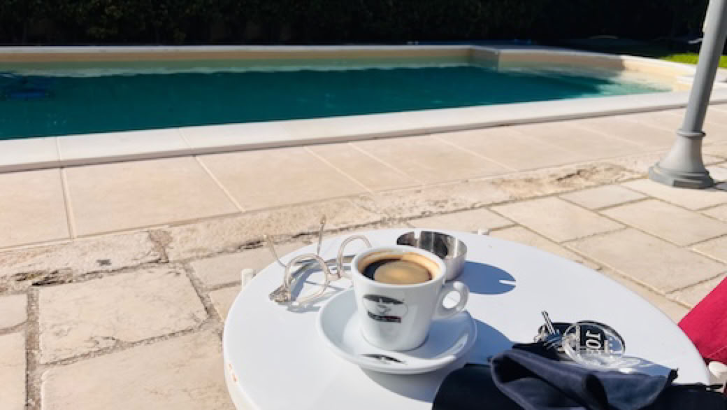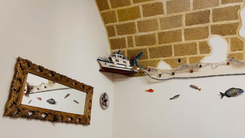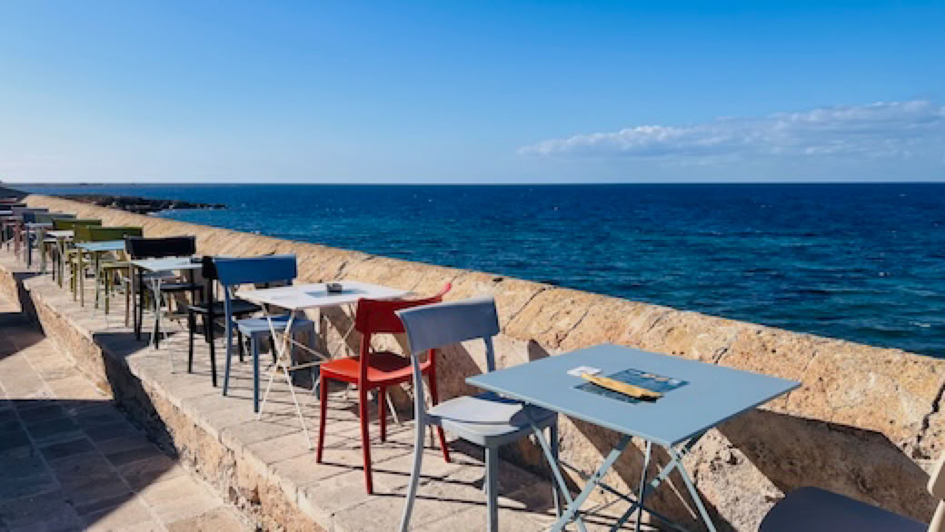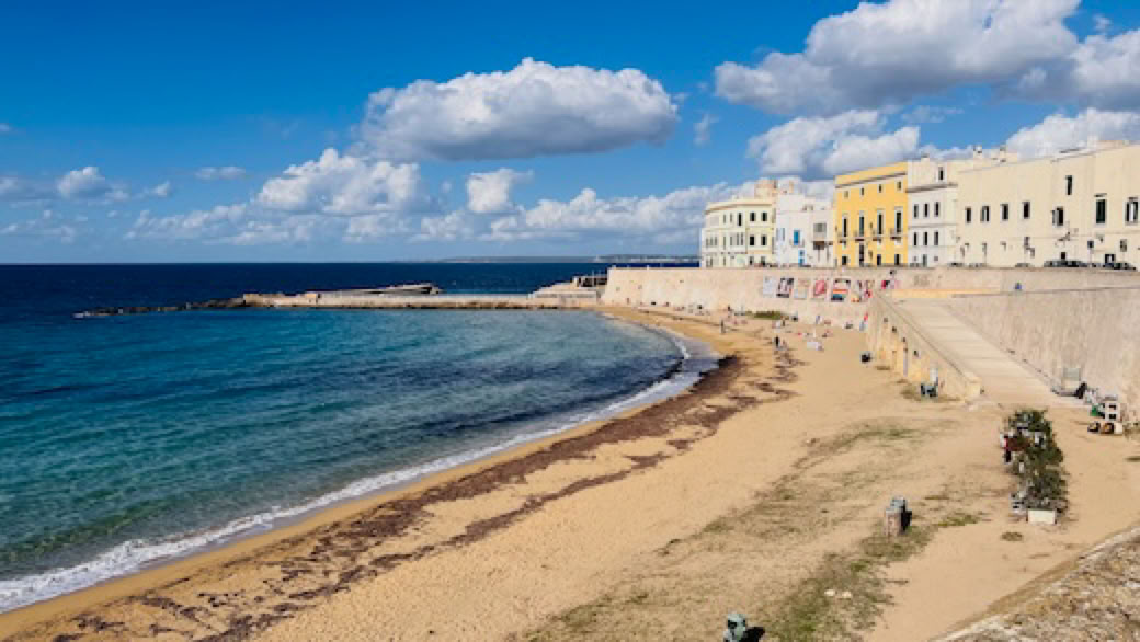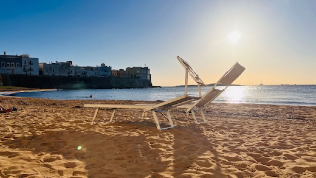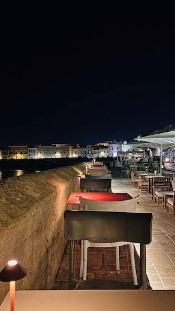 Après un dernier bon petit déjeuner à l’hôtel Casino Ridola et un café au soleil au bord de la piscine, nous prenons la route vers Gallipoli via Tarente et en suivant plutôt des routes secondaires le long de la côte Ouest du talon de la botte. Pause café et plein de la Jeep vers 11h dans une station ENI et arrivée à Gallipoli à 13h. Nous garons la voiture sur le parking du port et découvrons le charmant front de mer de la ville historique. Il fait vraiment très beau, et nous nous installons au soleil sur les petites tables colorées d’un café, en surplomb de la mer et de la plage. Nous mangeons un peu en profitons de la vue et en attenant la disponibilité de notre logement. Vers 14:30, nous allons Via Galateo où se trouve notre « hôtel ». Dans une ancienne maison bourgeoise, toute en hauteur, notre chambre se trouve tout en haut, accessible par d’étroits escaliers de pierre, pas facile avec les valises. Nous avons une petite terrasse privative et la décoration de la chambre est moderne et chaleureuse. Au dessus de la chambre, il y a encore une autre terrasse et même une sorte de vigie avec vue !