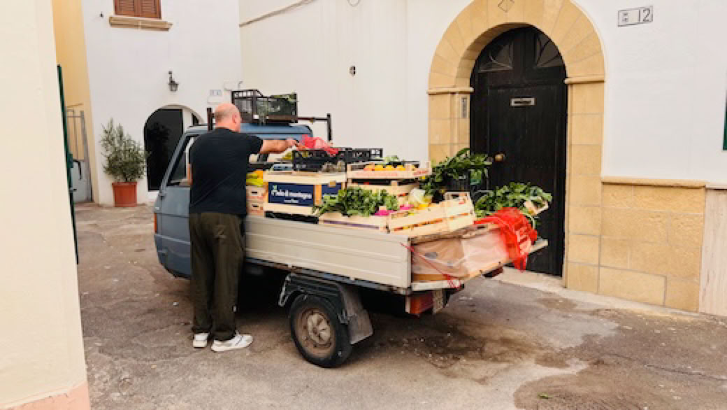 Après notre petit déjeuner dans la belle salle commune de la Casa Galateo, nous rejoignons en bord de mer les Morues U. et X. qui sont aussi en vacances dans les Pouille avec leur famille. Toujours sous un grand soleil, nous prenons un verre en terrasse, puis nous nous promenons dans la vieille ville, visitons l’église Saint François d’Assise et la Basilique Sant’Agata et le marchand de fruits et légumes ambulant en vespa nous amuse bien. Nous nous séparons de nos amis et prenons la route vers Leuca, la ville la plus au Sud de la botte italienne.