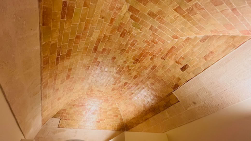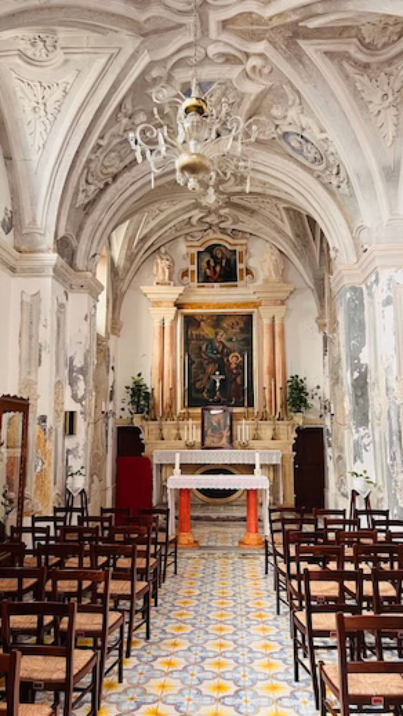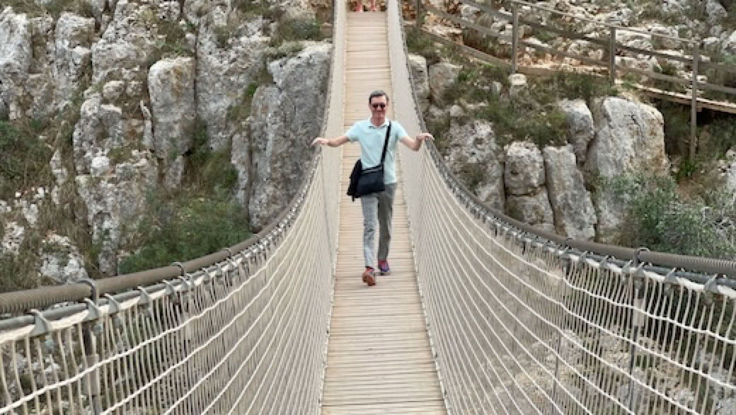 Nous partons à la découverte, en plein jour cette fois, de cette ville étonnante. Beaucoup de touristes (dont beaucoup de français, d’ailleurs), il fait très beau, voire chaud. Nous parcourons les rues principales, pavées de pierre. Nous entrons dans quelques-unes des nombreuses églises, dont la belle église romane Saint Jean Baptiste qui tranche avec les autres églises à la décoration riche et baroque. En fin de matinée, nous voulons visiter la cathédrale mais l’office dominical est en cours. Nous prenons notre café américano en terrasse en face de la cathédrale. Nous redescendons en bas de la ville, sur la rue qui borde le canyon. Nous y trouvons le départ de la randonnée qui mène de l’autre côté du canyon et décidons, un peu à l’improviste et sans eau ni casse-croute, nous nous engageons. Evidemment, ça descend fort, puis au fond, pour traverser la rivière, une magnifique passerelle suspendue, qui bouge bien quand on la traverse. Petit moment d’émotion … qui se poursuit car le chemin qui monte l’autre rive est aussi impressionnant. Le chemin passe devant des grottes qui ont servi d’habitat troglodytique, et devant une église rupestre qu’on aperçoit à travers des grilles. Une dernière échelle pour arriver sur le plateau. L’endroit permet d’avoir une belle vue panoramique sur la ville, y compris la partie la plus ancienne, abandonnée. Après un moment de contemplation, nous entamons le retour. Pierre anticipe avec appréhension le passage sur la passerelle, mais tout se passe bien, et nous revenons en ville … assoiffés. Nous nous rafraîchissons d’une limonade dans un café, nous achetons une focaccia dans une bonne boulangerie et retournons nous reposer à l’hôtel dans notre belle chambre. Vers 16h, nous retournons dans le centre pour la visite de la cathédrale et de son musée attenant. La nuit tombe vite, à 17:00, il fait déjà presque nuit. Nous visitons aussi la très jolie église Saint Pierre et Paul, avec son superbe plafond en bois peint. Pierre y met un Euro pour l’éclairer 😊. Retour à l’hôtel, j’en profite pour faire quelques brasses dans la piscine extérieure, un peu froide. Enfin, nous redescendons en ville pour le dîner chez Francesca. La salle du restaurant est creusée dans la roche. La cuisine est vraiment excellente et raffinée, le vin blanc de la région est très bon et le service agréable. Bref, une bonne adresse. C’est bien fatigués que nous retournons à l’hôtel pour une bonne nuit.