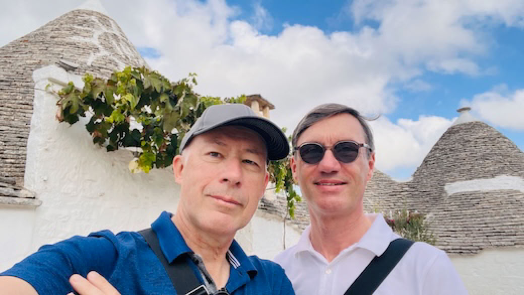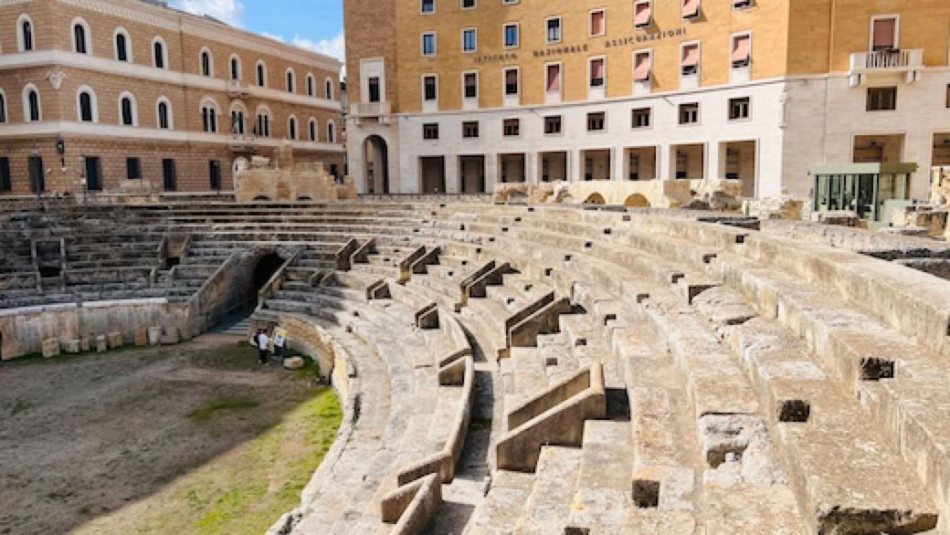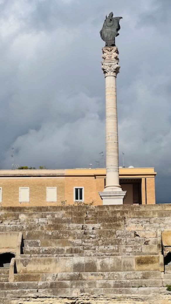 Pierre a retrouvé la forme et nous quittons notre résidence Casa Galateo de Gallipoli à destination de Polignano a Mare, mais nous allons d’abord profiter du trajet pour visiter la belle ville de Lecce. C’est une grande ville et nous trouvons de la place dans un grand parking souterrain juste à l’extérieur du centre historique. Il fait chaud mais le ciel est couvert … Après avoir salué la statue de Giuseppe Garibaldi dans un parc, nous entrons dans la vieille ville. Puis nous passons devant la Basilica di Santa Croce, sans visiter (payant), nous visitons la Chiesa del Gesù et son impressionnant plafond de bois peint. Sur la grand place Sant’Oronzo se trouve un ancien amphithéâtre romain, donc seul un tiers environ a été excavé, le reste étant sans doute à jamais recouvert par la ville. Néanmoins la visite est intéressante et l’on apprécie toujours l’ingéniosité de construction des romains de l’époque. Il tombe quelques gouttes et il y a un peu de vent, ce qui ne nous empêche pas de prendre un americano en terrasse. Poursuite de la visite de la vieille ville, visite (payante) de l’impressionnante cathédrale et de son immense crypte. Avant de retourner à la voiture, nous entrons dans une librairie où j’achète un livre, « L’isola del giorno prima » d’Umberto Ecco … en italien (je viens de finir mon premier livre en italien, une petite romance gay « Se non fosse piu un segretto »).
