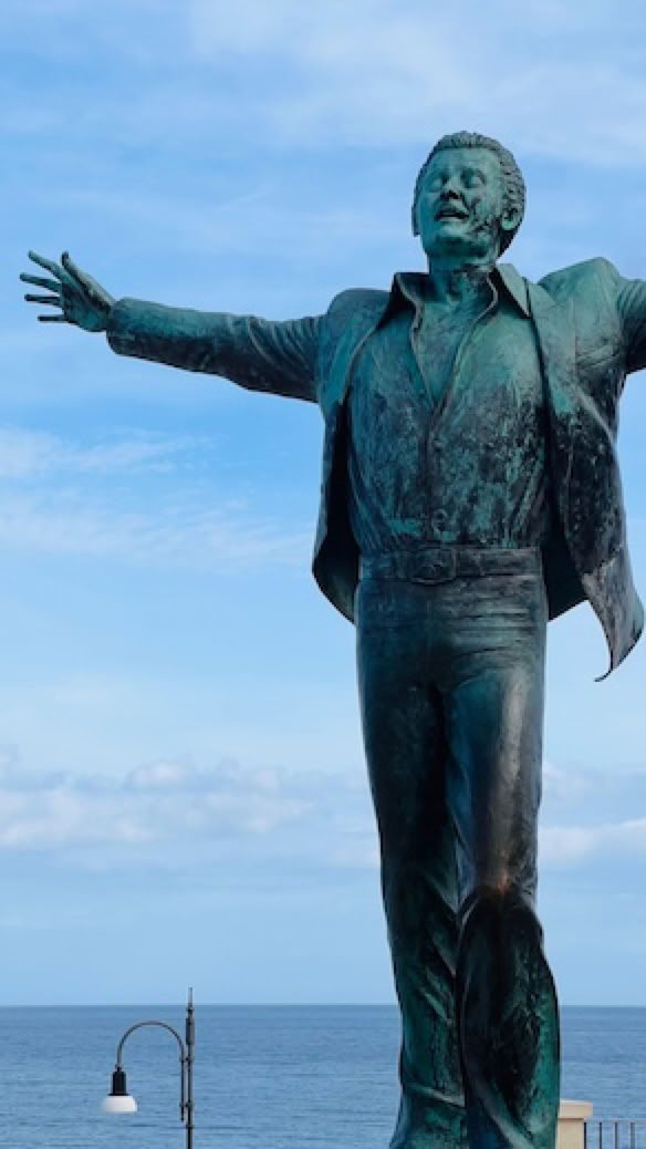 C’est vraiment très agréable sous le soleil. Les maisons en surplomb des falaises font penser à Bonifacio (en moins haut, quand même, et moins riche). Je n’ai pas mon maillot de bain sur moi, sinon, je serais allé me baigner (je ferai ça le lendemain …). Les gens se prennent en photo devant la statue de Domenico Madugno, enfant du pays et chanteur du tube mondial « Volare ». Café americano au soleil. Puis à l’autre bout de la ville, nous tombons un peu par hasard sur un petit musée d’art moderne, le musée Pino Pascali. Quelques oeuvres intéressantes, d’autres … étranges !