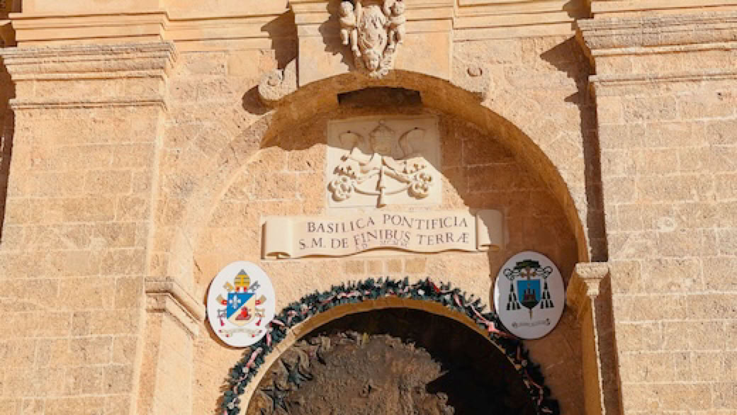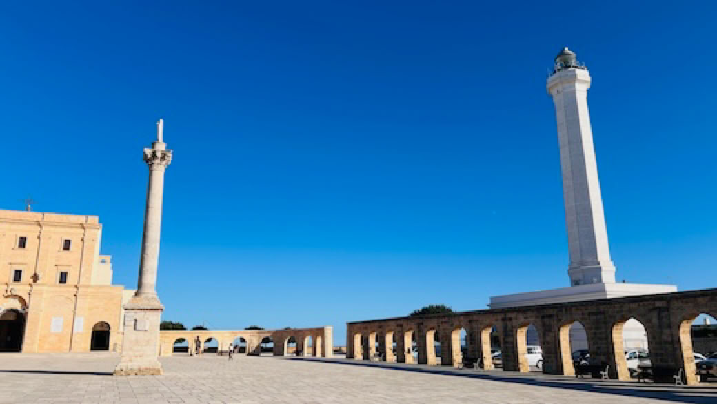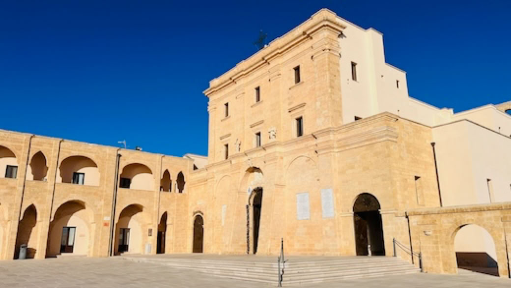 Sur le coup, la ville balnéaire nous parait un peu déserte et nous nous promenons sur la digue. Quelques belles maison sur le front de mer. Puis nous nous dirigeons vers le belvédère à l’Est de la ville. Nous nous retrouvons au pied d’un double escalier monumental de part et d’autre d’une cascade asséchée. Nous nous essoufflons un peu pour gravir toutes ces marches et nous débouchons sur une vaste esplanade avec le phare, une vue panoramique de la mer Adriatique à l’Est jusqu’à la Méditerranée à l’Ouest et imposante, le Sanctuaire de Sainte Marie de la fin des terres (Santuario di Santa Maria de Finibus Terrae). Le sanctuaire a été consacré par Jean-Paul II et visité par Benoit XVI, excusez du peu. L’endroit est magnifique, baigné par un beau soleil d’automne.