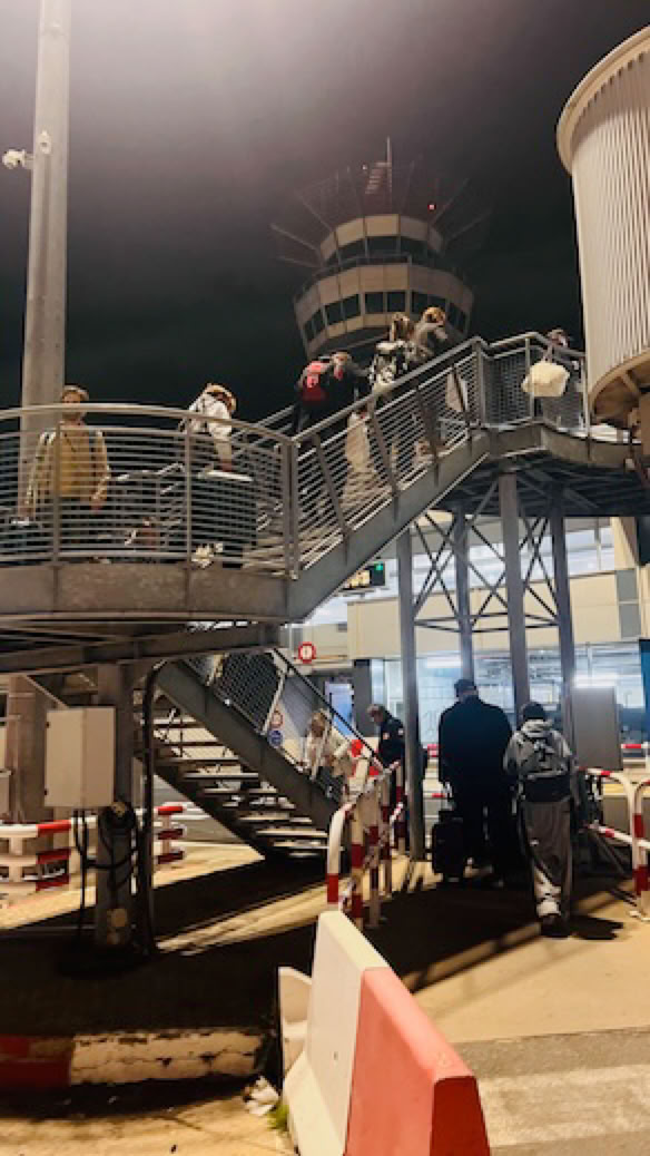 Dernier petit-déjeuner à l’extérieur, et peu après 10h, nous embarquons nos bagages dans la Jeep pour 5h de route de Polignano à Rome Fiumicino. A priori, nous avons beaucoup de marge par rapport à l’embarquement prévu à 19h, mais il y a toujours la crainte d’avoir des embouteillages en arrivant sur Rome. En fait, la route se déroule sans aucun soucis et nous déposons donc la voiture chez Sixt quasiment quatre heures avant l’embarquement. Nous commençons donc par manger un peu dans une cafétéria, puis nous patientons, longtemps, debout, devant le comptoir d’enregistrement de Transavia pas encore ouvert. Nous sommes donc les premiers à déposer nos bagages quand le comptoir ouvre enfin. Nous passons la sécurité très vite (beaucoup mieux organisé que la Sécurité à Orly ou Roissy) et … nous devons attendre encore plus d’une heure avant que notre porte d’embarquement ne soit affichée. Nous patientons donc avec un thé dans le food-court de la zone de départ et arrivons enfin à notre porte d’embarquement. L’avion arrive à l’heure, mais nous patientons encore longtemps, debout, dans la zone de pré-embarquement avant de pouvoir, enfin, nous assoir à nos places 9A, 9B dans une A320 Neo presque neuf. L’avion partira finalement avec un peu de retard. Le vol est très confortable et silencieux dans cet avion moderne. Je somnole un peu, car la journée a été fatigante, avec la route et toute cette attente à l’aéroport.