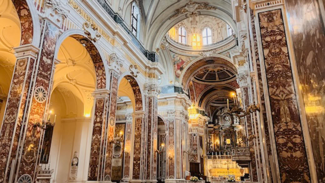 Après une pause, nous partons à la gare de Polignano pour prendre le train pour Bari, la capitale des Pouilles. Nous avons un peu de mal à comprendre le système de paiement « tap tap » mais nous voilà confortablement installés pour 45’ de train. Arrivés à Bari, une très grosse averse nous accueille. Nous restons tranquillement 10’ à l’abri de la gare avant d’aller vers le centre et le bord de mer. Nous nous promenons d’abord sur la jolie digue au style romantique avec ses lampadaires en fer forgé, nous admirons un rameur athlétique dans son canoë-kayak sur la mer calme, Nous montons ensuite dans la vieille ville et son chateau, nous trouvons une bonne patisserie car Pierre est au bord de l’hypoglycémie, puis redescendons vers le port de commerce. Le jour tombe déjà. Je remarque une étrange construction, une forme d’église en transparence, faite d’un treillis métallique. Nous nous approchons et il s’agit effectivement d’une oeuvre en construction qui reproduira une ancienne église qui occupait ce site. C’est une très belle idée, et ce sera à revoir une fois terminé. Nous visitons enfin la très belle Basilica Pontificia San Nicola, une église d’inspiration romane, à la décoration plus sobre que la moyenne des églises italiennes, avec néanmoins un superbe plafond peint et avec la particularité d’une arche légèrement en diagonale par rapport à la nef. Enfin, nous retournons vers la gare de Bari, en passant cette fois par les « Champs-Elysées » de la ville, la Via Sparano da Bari, toute illuminée. Retour à Polignano en train.